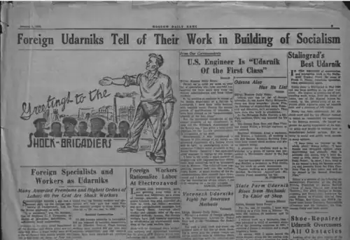 7. ^ a b c Arnoff, Samuel (January 1, 1933). "Foreign Udarniks Tell of Their Work in Building of Socialism". No. 1. Moscow News. Moscow Daily News. Retrieved April 22, 2021.