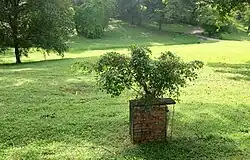 In 1971, Malay newspaper Berita Harian reported the existence of a small mosque being attached to the monumental tomb-shrine of the semi-legendary king Iskandar Shah at Bukit Larangan, described as having a zinc roof.[36] The mosque and other adjoining facilities were demolished by 1975 while the tomb-shrine was retained and upgraded over the years, losing its religious attributions gradually, but eventually becoming a prominent monument of the Fort Canning site.[3] The tomb-shrine, now known as Keramat Iskandar Shah, is currently a tourist attraction and no longer a religious site, with the only religious elements being the crescent moon and star embedded on the stone sarcophagus that is placed on top the plastered-over grave.[3]