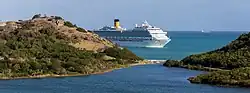 Remains of Fort Barrington on Goat Hill (left), with cruise ship passing behind it