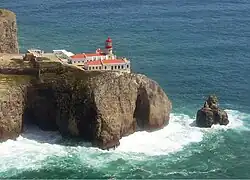 Fort São Vicente (Fortaleza de São Vicente in Portuguese) is a military monument in Sagres, in the Algarve region of Portugal. It consists of the remains of a fortification, with a lighthouse inside.[1] It was built in the 16th century to protect a coastal strip and an existing monastery on the site.[1] In 1587 it was destroyed by British privateer Francis Drake, and rebuilt in 1606.[2] In the mid-19th century, a lighthouse was built on the site, which was replaced by a new one in the early 20th century.[3] In the mid-2000s, Cape São Vicente was closed to the public for construction work.[4]