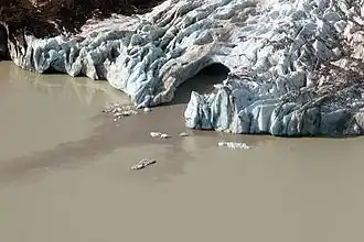 Terminus of Fourpeaked Glacier with dark-colored sediment issuing from an elongate tunnel in the ice. Photo taken Sept 20, 2006 | |