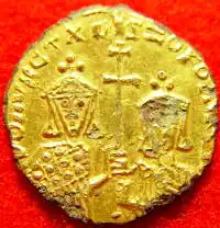 A Byzantine fourrée solidus, depicting Romanos I Lekapenos (left) and his son Christopher Lekapenos (right).