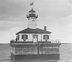 The United States Lighthouse Service intended from the time of design that this light would be automated (possibly the first such instance)[7] and operated by radio control[8] from the nearby Poe Reef Light which is 3.5 miles (5.6 km) away; the keeper's house was never intended to be used as a residence.[9] In 1925 a temporary acetylene buoy was installed there and construction of the permanent light began in 1929 such that the light could begin operation in 1930.[10]