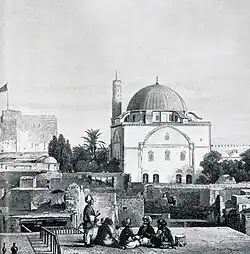 The sailing voyage ended in Alexandria, Egypt, from which the delegation continued to Cairo and farther south to take photographs of the Pyramids and various other sites. From Cairo, the delegation travelled by land to Jerusalem, where they stayed from December 11 to 14, 1839.[1] During this time, Fesquet photographed Jerusalem from the Mount of Olives, including the Temple Mount, the city walls, and its surroundings.[13][14] From Jerusalem the expedition continued to Acre, where Fesquet photographed the old city from its rooftops, the people staying there, and the Crusader fortress in the background. Finally, he photographed the city of Nazareth and its surroundings. From Nazareth, the delegation continued to Damascus, then Turkey, and returned to Paris in the beginning of 1840.