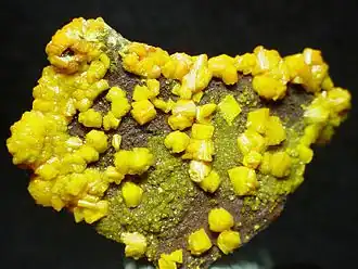 ![]() Yellow crystals of francevillite on matrix with small mounanaite crystals (specimen size, 4 x 3.5 x 1 cm) | |