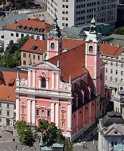 The Franciscan Church of the Annunciation (Slovene: frančiškanska cerkev Marijinega oznanjenja or commonly frančiškanska cerkev; officially Cerkev Marijinega oznanjenja) is a Franciscan church located on Prešeren Square in Ljubljana, the capital of Slovenia. It is the parish church of Ljubljana - Annunciation Parish. It was built on a site where two or possibly three churches stood earlier between 1646 and 1660 (the bell towers following around 1720) under the management of Francesco Olivieri and Francesco Rosina, and its exterior was redesigned in 1858 according to plans by Franz Kurz zum Thurn und Goldenstein. The frescoes in the interior were added in the mid-19th century by Matevž Langus and on the ceiling by Matej Sternen in the first half of the 20th century, whereas the main altar was mostly made by the Baroque sculptor Francesco Robba (1736). The red or pink colour of the church is symbolic of the Franciscan monastic order.[1][2][3] Since 2008, the church has been protected as a cultural monument of national significance of Slovenia.[4]