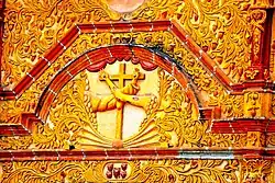 The pediment contains a large cross in relief of two styles related to the Franciscan and Dominican orders.[12][13] The main cross at the top represents redemption with the crosses of Calatrava and Jerusalem on either side. Indigenous elements are found in the church's interior, with an image of a jaguar and a person with Olmec features.[16][17] The bell tower is narrow and the baptistery is at the base of this tower. On the lower part appears a small window which illuminates the baptistery. The cupola of the tower is in a pyramid shape with a Baroque iron cross on top.[13]