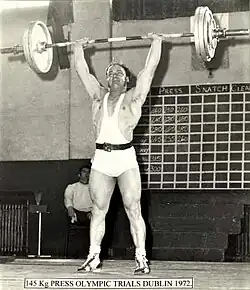 Rothwell at the 145kg Olympic press lift trials, Dublin, 1972