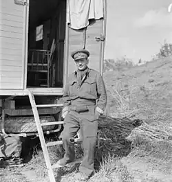 Eventually Montgomery managed to convince Major-General Walter Bedell Smith, Eisenhower's chief of staff, of the merit of his plan and Smith was able to convince Eisenhower on 3 May.[82] With the notable exception of Operation Ladbroke the airborne landing, which failed, the Eighth Army's assault on 10 July was successful. Montgomery went ashore the following day, only to find that his headquarters vehicles were missing. A sharp signal was sent to de Guingand, who managed to sort the problem out.[83][84] For his services in Sicily, de Guingand was appointed Companion of the Order of the Bath on 12 October.[85]