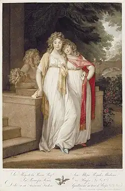 The double engagement was celebrated in Darmstadt on 24 April 1793, only a few weeks after the sisters fortuitously met their future father-in-law at the theatre. On 24 December, Duchess Louise and Crown Prince Frederick William were married in the Royal Palace of Berlin; two days later, on 26 December, Duchess Frederica and Prince Louis were also married at the same venue.[1]