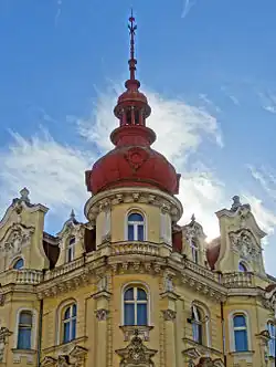 Construction started in October 1896, the reception happened on January 28, 1898.[3] Local companies were employed, such as master bricklayer Hermann Lewandowski, master roofer Julius Jakoby, carpenter Menning.[3] The ground floor was devoted to shops and restaurants, while the upper ones displayed for luxury apartments. In the building was installed in 1898 the first electric lift in the city, imported from Berlin.[4] The corner location of the building enabled its symmetrical shape, the symmetry axis being underlined by a tower covered ending in a bulbous dome.