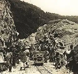 A "Section Chief" in the building of the Dakar–Niger Railway, pushed by African workers, Kayes, Mali, 1904