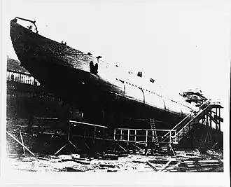On 6 November 1942, Le Conquérant entered drydock at Casablanca for a refit that was scheduled for completion in early December 1942.[3] On 8 November 1942, however, Allied forces landed in French North Africa in Operation Torch[3] and the Naval Battle of Casablanca began between United States Navy and Vichy French forces. At 06:15, the U.S. Navy aircraft carrier USS Ranger (CV-4) and escort aircraft carrier USS Suwannee (CVE-27) launched an airstrike against Casablanca, and SBD Dauntless dive bombers began attacking targets in the harbor at 07:10.[3] Although Le Conquérant's attack periscope was not installed and she had no torpedoes aboard,[8] leaving her unfit for combat, she was launched from drydock and cast off at 08:00.[3] Moments later, a 16-inch (406 mm) shell fired by the U.S. Navy battleship USS Massachusetts (BB-59) sank the drydock.[3]
