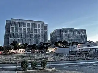 The Fresno County Jail processes and secures detainees from law enforcement agencies within Fresno County along with State and Federal inmates.[2][3][4] In addition, the Fresno County Sheriff's Department also runs a Satellite Jail located two miles away from the main facility.[2][3][4] The maximum inmate capacity for the Main Jail is 1,101, North Jail is 1,728, South Jail is 500, and Satellite Jail is 350, for a combined maximum capacity of 3,814 inmates who are supervised by over 350 correctional officers.[2][3][4] The South Annex Jail was built in 1947, the Satellite Jail in 1986, the Main Jail built in 1989, and the North Annex Jail built in 1993.[7][4] The jail is also connected above ground to the Fresno County Sheriff's Office and is adjacent to the Fresno Police Department, Fresno U.S. Marshals field office, Fresno DEA field office, and multiple courthouses.[2][3][4] The average number of bookings processed annually into the Jail is 42,012.[3]