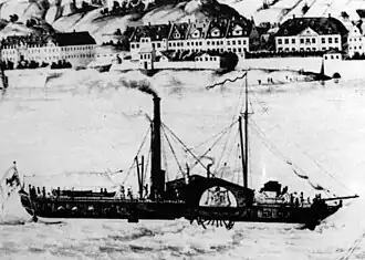 In 1825 the Dampfschiffahrts-Gesellschaft von Rhein und Main (DGRM) was founded in Mainz. It ordered three steamboats at the Nederlandsche Stoomboot Maatschappij (Dutch Steamboat Comp.), with which it cooperated. These were meant to steam between Mainz and Mannheim, from Mannheim to Kehl and Strasbourg and between Mainz and Frankfurt am Main.[6] The idea was that the Nederlandsche Stoomboot Maatschappij would offer transport between Rotterdam and Cologne.[7]