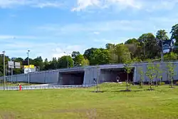 The Frodeåsen Tunnel (Norwegian: Frodeåstunnelen) is a 1,910-meter (6,270 ft) long twin-tube, four lane road tunnel in the town of Tønsberg in Tønsberg Municipality in Vestfold county, Norway. The tunnel is part of County Road 300, and it runs through the large hill Frodeåsen between Kjelle and Velle north of the city center.[1] Built as part of the "Tønsberg Package", construction started on 28 October 2004 and the breakthrough was made on 9 March 2006.[2] The tunnel and the new County Road 300 opened on 13 March 2008, creating a bypass road north of the town of Tønsberg.[1]