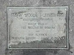 The Tompkins House was adjacent to and not technically part of the subdivision, but the land was sold under the conditions of the Frost Woods Homes Agreement, which "encouraged" new construction to be "in harmony" with neighboring structures. Other sites include the Robert C. Pooley house (6003 Winnequah) and the John Marshall house.[6] All of the modern houses mentioned were designed by Hamilton and Gwenydd Beatty or Hamilton Beatty and Allen Strang, with a total of 12 in Frost Woods.[7] The Owens, Beattys, Strang, Pooley and Ednah (Mrs. C.W.) Thomas all contributed to create the Frost Woods neighborhood park.[8] Frost Woods became part of the Village of Monona when the latter was incorporated in 1938.