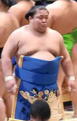 He sat out the March 2014 tournament, recuperating after a detached retina operation. This led to his demotion back to jūryō for the following May 2014 tournament where he only managed a 7–8 record. He won the jūryō division championship in March 2015 and was promoted back to makuuchi, but his return to the top division lasted only one tournament as he could only score 3–12. This has been his last makuuchi appearance to date. He was demoted to the makushita division after the September 2016 tournament, but promoted back to jūryō for March 2017 after a 5–2 score at makushita 3 in January. His stay in jūryō lasted only one tournament and he was back in the makushita division in May 2017. He reached the top rank of the makushita division, #1 East, in May 2019 but just failed to get the majority of wins that would have returned him to jūryō, scoring 3–4. However, he remained near the top of the makushita division and he returned to jūryō after 18 tournaments away for the July 2020 tournament (originally scheduled for May). He maintained his position in jūryō for the September 2020 tournament, but was prevented from entering it due to a COVID-19 outbreak at his stable.[2] Fujiazuma was one of the 19 wrestlers who tested positive.[3] He and the other members of the stable were allowed to keep their ranks for the following tournament in November. In this tournament Fujiazuma lost every one of his fifteen matches, the second straight jūryō wrestler to suffer this fate after Oki in the previous tournament.[4]