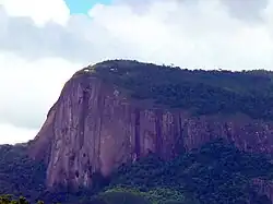 Despite its relatively small area, Fundão extends from the coast to the Serra do Castelo, a prominent geographical feature in central Espírito Santo.[91] Its terrain is highly undulating, with 61.53% of its area having a slope of less than 30%.[93] The eastern region consists of lowlands and a nearly straight coastline, except for the Flecheira point, while the western region features elevations shaped by crystalline rocks.[4] Located 13 kilometres (8.1 mi) from the seat, on the border with Santa Teresa, is the Pico do Goiapaba-Açu, a granite formation[4] rising 850 metres (2,790 ft),[94] offering views of the region between Greater Vitória and Linhares.[91]