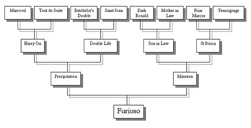 Furioso's lineage, including the horses Precipitation, Son-in-Law, Double Life, and Dark Ronald[1]