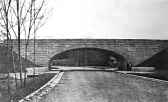 Funding for the proposed parkway along Furnace Brook was passed by the Massachusetts General Court in 1901.[9] The proposed route of the parkway was soon also scheduled for use in directing a portion of a major sewer line from Boston to Nut Island at the end of Hough's Neck in 1902.[10] The western part of the parkway was both planned and completed first, with plans for the section from Wampatuck Road to Hancock Street submitted in 1903.[11] Construction of the roadway began in 1904, with a major component, a granite-faced concrete bridge carrying the Granite Branch of the New York, New Haven and Hartford Railroad over the parkway route completed in 1906.[12] Subgrading of the road surface from the Blue Hills Reservation to Adams Street was also completed at that time.[13] Construction of the roadway from Blue Hills to Adams Street and most of the land acquisition required for the continuation of the route to Quincy Shore was completed by January 1908.[14]