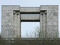 The mausoleum was dynamited in 1945 and in 1955 a monument to the Silesian insurgents (Polish: Pomnik Czynu Powstańczego), designed by Xawery Dunikowski, was dedicated in its place on the tenth anniversary of the liberation.[43] This is a simple classical design with four pillars in rectangular section surrounding an eternal flame and supporting architraves, under which are four massive granite sculptures of "Silesian heads". There are industrial symbols on the gables. On the inside, the pillars are decorated with stylised depictions of miners, Silesian peasants, ironworkers, and a mother with a child on her arm in the manner of caryatids, while the exterior surfaces have drawings outlined in lead of everyday and work scenes from the present and the past and scenes of the uprising itself.[21] These included conflicts with the Germans since the medieval period of the Teutonic Knights, implying eternal enmity between Germans and Poles, and for the 25th anniversary of the uprising in 1946, urns containing ashes of people killed by the Nazis in the Warsaw Uprising had been interred there.[43] However, by 1955 the anti-German message was overshadowed by the message of praise for the forerunners of the Communist state.[43]