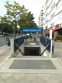 Güntzelstraße is a Berlin U-Bahn station on the U9 line. It is located in the central Wilmersdorf district of the city. The station designed by the BVG architect Rainer G. Rümmler opened on 29 January 1971 with the line's extension from Spichernstraße to Walther-Schreiber-Platz.[1] The station and the adjacent street are named after Karl August Bernhard Güntzel, mayor of Wilmersdorf from 1886 to 1892.
