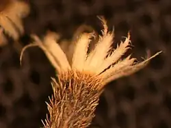 The pappus scales have fringed margins and an elongated, fine tip.