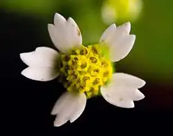 The small flower heads are up to a centimeter wide (0.4 inches) but typically 2-3mm in diameter and have rounded center filled with many disc florets usually in a shade of bright yellow. There are typically five white ray florets widely spaced around the center, each an oval shape typically with three crenate teeth at the tip. Both the disk and ray florets are fertile[7] producing an achene with a large pappus.[4][8][5]