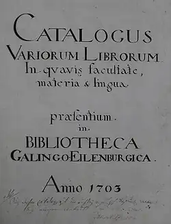 After World War II, as a result of securing former German book collections, the books of the Eulenburg family and the church in Galiny were transferred to the Nicolaus Copernicus University Library in Toruń, where currently there are approximately 1,053 bibliographic items of old prints in approximately 552 volumes and 8 manuscripts. The small collection of manuscripts consists of works on various topics in German or Latin, including the handwritten library catalog of the Eulenburg family library from 1703: "Catalogus variorum librorum in quavis facultate materia et lingua praesentium in Bibliotheca Galingo-Eilenburgica Anno 1703". The catalog is divided into sections (theology, law, medicine, philosophy, varia), and the books within the sections are arranged according to format. Descriptions are short and consist of a fragment of the title and the author. The catalog, which has 21 pages, has separate Arabic numbering for each section. The layout of the catalog indicates that after the collections were transferred to the church, a completely different classification was created to organize the collections, using the abbreviations Tit., Roman and Arabic numerals.[9]
