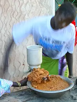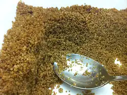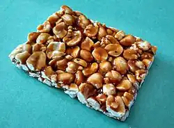 • Groundnut cake, referring to either groundnuts with a thick ginger and sugar coating, or groundnuts shaped into a flat disc by hardened caramelised sugar.[2]