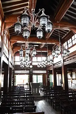 The composition of the church combines elements of both Eastern and Western architecture, with its layout particularly resembling Buddhist temples.[1] Similar to Buddhist temples, it has a number of gates that are entered in sequence. The main cathedral building is a wooden building built in a nearly completely Korean style, with little Western ornamentation. It still functions as a church building.[1]