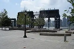 Gantry Plaza State Park is a 12-acre (4.9 ha) state park[1] on the East River in the Hunters Point section of Long Island City, in the New York City borough of Queens. The park is located in a former dockyard and manufacturing district, and includes remnants of facilities from the area's past. The most prominent feature of the park is a collection of gantries with car float transfer bridges, which in turn were served by barges that carried freight railcars between Queens and Manhattan.