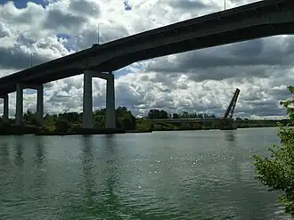 The Garden City Skyway is a major high-level bridge located in St. Catharines and Niagara-on-the-Lake, Ontario, Canada, that allows the Queen Elizabeth Way (QEW) to cross the Welland Canal without the interruption of a lift bridge. Six lanes of traffic are carried across the bridge, which is 2.2 kilometres (1.4 mi)[2] in length and 40 metres (130 ft) at its tallest point.
