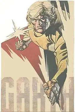 Steve Dowling and Gordon Boshell were the originators of the Garth character. Dowling wanted to create a British adventure comic strip and took inspiration from the American comic strips Superman,[2] Flash Gordon and Terry and the Pirates.[3] Dowling and Boshell hired 15-year-old John Allard to work on Garth, who stayed with the strip for its entire run. After 69 adventures, Dowling retired and handed Garth over to Allard, which he carried on until 1971, when Eagle comics' Dan Dare artist, Frank Bellamy, took over the art with Allard writing.[1] Garth's longevity had been established by Don Freeman, who created almost every basic Garth plot on which it was built.