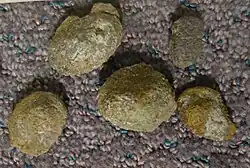 Gastonia was protected by osteoderms, skin ossifications. The neck was covered by at least two bone rings. Usually in ankylosaurs these have the form of "halfrings" leaving the underside unprotected, but with Gastonia only two segments seem present, one at each side of the midline, causing Kirkland to refer to them as "quarter rings". Each segment had a pointed keel and a hollow underside. Kirkland stressed that the rump armour was hard to reconstruct because it had not been found in articulation. The sides of the thorax seem to have been covered by about five pairs of large flat triangular spikes. They are recurved and have a deep groove in the rear side. They gradually decline in length to behind, the groove becoming relatively shorter and the base length increasing. According to Kirkland the function of the groove was to receive the front edge of the next spike. Other large flat spikes found, lacked the groove. They were often very curved, the point at a right angle with the base. Kirkland assumed these formed two vertical rows, one at each side of the rump midline. Lower triangular spikes he placed at the sides of the tail, again gradually decreasing to the rear. In between the horizontal and vertical spikes of the rump probably rows of osteoderms were present having the profile of a droplet, with a vertical point at the broader end. The top of the tail had oval plates. The hip region was covered by a large pelvic shield consisting of fused osteoderms. These were patterned as rosettes with a larger plate in the middle, surrounded by at least two rings of smaller plates. Kirkland assumed that four pairs of triangular spikes covered the sides of the pelvic shield also,[2] but this was denied by Paul.[9] The area between all these larger elements was covered by small ossicles, round bony scutes with a diameter of up to two centimetres, hundreds of which have been discovered.[2]