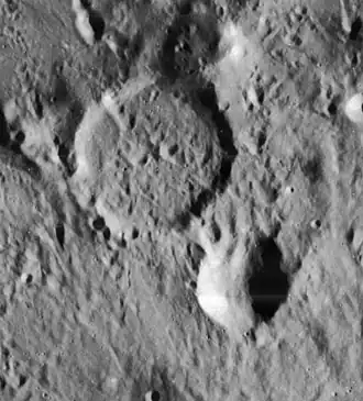 To the southwest is a wide rille named Rima Gay-Lussac. This is a nearly linear formation with curves at the end. It follows a 40-km-long line from the southwest to the northeast.