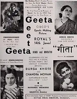 Geeta is a Bollywood film directed by Parshwanath Yeshwant Altekar and starring Chandra Mohan, Durga Khote and Anant Marathe. It was released in 1940.[1][2] The film produced under the Circo Productions banner was a bilingual made in Hindi and Marathi.[3] The story was written by Minoo Katrak who in later films was to become a renowned sound recordist. The cinematographer was Gordhanbhai Patel and the film's music was composed by Datta Koregaonkar. It's dialogues and song lyrics were by S. K. Kallah with screenplay by Altekar.[4] The rest of the cast included Trilok Kapoor, Ashalata, Vatsala Kumtekar and Baby Suman.[5]
