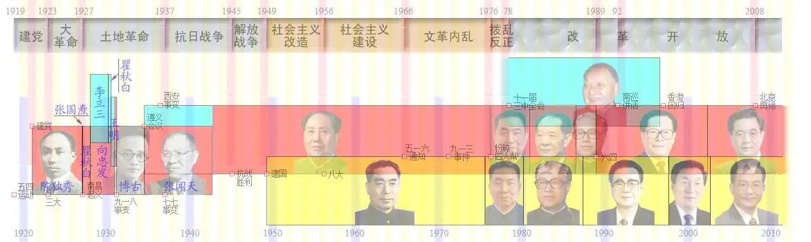 Simplified Chinese graphic timeline of CCP leadership to 2012. The red bar indicates CCP General Secretaries, the yellow indicating the Premiers. The gray bar delineates particular periods of mainland Chinese history from a CCP perspective.