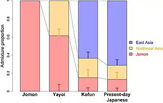 Historically, Japanese people received genetic contributions from peoples related to the Jōmon period,[1] Yayoi period,[2][3] and arguably, the Kofun period (Toraijin).[4][5]