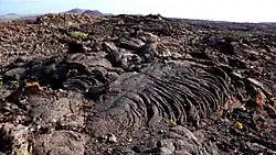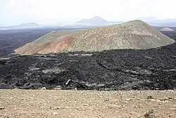 At about 2.7 Ma, in the late Pliocene Epoch, the rejuvenation stage began. It produced much less lava than the earlier shield stage, mainly at the Montaña Roja and Montaña Bermeja volcanoes in southern Lanzarote.[61] Then, throughout the subsequent Pleistocene and Holocene epochs, the rejuvenation volcanism has continued and has been dominated by strombolian-style eruptions of lava from sets of volcanic cones aligned along numerous northeast–southwest fissures in the central part of Lanzarote.[65] Geologically recent examples of Lanzarote's rejuvenation stage volcanism include eruptions at Montaña Corona (about 21,000 years ago), Timanfaya (1730–1736) and Tao/Nuevo del Fuego/Tinguatón (1824).[66][32][67]