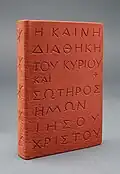 Among the books in the George Baer Collection of Bookbinding (Rare Book Collection, Louis Round Wilson Special Collections Library, University of North Carolina at Chapel Hill) are four books that Baer bound during his years in Greece. These bindings nicely illustrate Baer's attempt to match the decorations with the books' contents. In Franz Spunda's Der Heilige Berg Athos (The holy Mount Athos is located in northeastern Greece) Baer chose to decorate the cover with Greek letters, most of them used just as decorations. But in the center of the cross, the letters ΙΣ ΧΣ (short hand for Jesus Christ) and NIKA (victorious or victory) are ones that frequently appear in Greek Orthodox Iconography. They symbolize that Christ is victorious. In Spyridon Loverdos's book Ho mētropolitēs Smyrnēs Chrysostomos, which describes the life and death of Chrysostomos, the Greek Orthodox bishop of Smyrna during the Turkish Greek War in 1922, Baer decorated the cover with the Double-Headed Eagle, which is of Byzantine origin and was the flag of the Holy Roman Empire from 1400-1800. The small Greek orthodox bible New Testament of our Lord and Saviour Jesus Christ, which measures just 5"x3" is bound in red Moroccan Goat leather. It is decorated with the title in classic Greek letters, thus serving as both the book title as well as its decoration. The final book from the Greek period is Vierzig Jahre auf dem Wasser (Forty years on the Water) by Otto Protzen. It is an account of Protzen's boating experiences with paddle as well as sail boats, mostly in northern Germany but also across the Atlantic to the Massachusetts coast. The figure on the blue leather binding is a Greek galley (a trireme), which seems out of place for a German book dealing with modern sailing in the North Sea. However, Baer had fallen in love with Greece, and followed his whims.