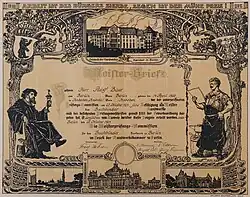 George Adolf Baer was born in Hoboken NJ of German parents, who had immigrated to the US in September, 1902,[2] but returned to Germany shortly after George’s birth. George grew up in Wiesbaden, a German city along the Main River, near Frankfurt. He served a three-year apprenticeship at a book binding company in Wiesbaden from 1919 to 1922. As he recounted in a taped interview,” this was not a fine binding establishment”.[3] It involved strictly binding books with cloth covers. After a year working in a paper making factory and teaching bookbinding at an art school, he decided to pursue fine bookbinding. He was accepted at the Berlin School of Applied Arts under the tutelage of Paul Kersten, one of the foremost bookbinders in Germany.[4] On October 25, 1924, at the age of 21, he received his "Meister Brief für das Buchbinder Handwerk"