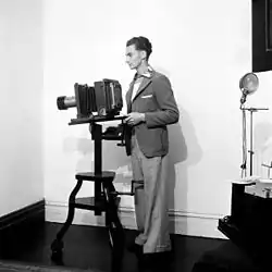 A 1939 photograph shows Caddy posing with the camera he used, a Voigtländer Bergheil plate camera with a wire frame viewfinder, flashlight attachment and roll-film back, producing 6x6 centimetre negatives.[1]