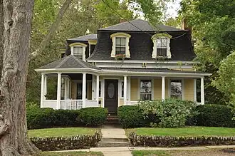 The George Cowdrey House stands near the crest of a hill northeast of Stoneham's Central Square, on the west side of High Street north of its junction with Cowdrey Street (which is also named for George Cowdrey). It is a modest two-story building, set on a large lot with a low stone retaining wall at the sidewalk. The house is covered with a mansard roof and has a clapboarded exterior. A porch wraps around to the left side, with a gazebo section at the corner. The porch is supported by round Tuscan columns and has dentil moulding at the eave. The mansard roof dormers are topped by segmented arches and have scrollwork framing around their windows. Stylistically sympathetic ells extend to the side and rear of the main block, which exhibits high quality craftsmanship both outside and inside.[2]