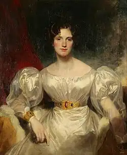 Early in his career Harlow had made sketches of performers in the theatre, notably of the actress Sarah Siddons, who retired in 1812. Later he reworked some of these drawings into paintings such as one showing Siddons in the sleepwalking scene from Macbeth, shown at the British Institution in 1815, and another showing the letter scene from the same play.[3] A commission from the music teacher Thomas Welsh[4] to paint Siddons as Queen Katharine in Shakespeare's Henry VIII. This was begun from memory, but subsequently the actress, at Welsh's request, gave the painter a sitting. While painting the portrait, Harlow decided to expand the picture into the "Trial Scene" from the same play, introducing portraits of the various members of the Kemble family and others. Welsh, though not consulted by Harlow concerning this change of plan, behaved generously. The picture was exhibited at the Royal Academy in 1817, and excited great public interest. It was neither well composed nor well executed, and owed much to the criticism and suggestions of Fuseli, whose portrait Harlow was painting at the time. Still, the portrait of Mrs. Siddons herself as the queen will remain one of the most striking figures in English art.[1] Harlow's next picture, The Virtue of Faith, at the Royal Academy, lacked originality, and had less success. It was purchased by his friend Mr. Tomkisson, who cut it into pieces for the sake of the heads.[1]