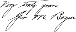 Bogue married Catherine M. Van Doren on January 26, 1871. They had six children, three surviving to adulthood. The Bogues were Presbyterians and attended the Hyde Park Presbyterian Church. From 1864 to 1892, Bogue was a member of the church's board of trustees. He was on the board of managers for the Presbyterian Hospital from its 1882 organization and served four years as its president. He was also on the boards of directors for the Home for Incurables and Lake Forest University. He was a member of the executive committee of the Presbyterian League of Chicago.[1]