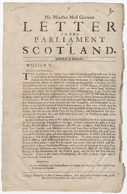 Broadside announcing appointment of George Melville, 1st Earl of Melville as commissioner to Parliament of Scotland, 1690