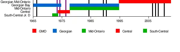 In, May 2010, The OHA confirmed the welcoming of The Caledon Golden Hawks have entered the GMOHL. In March 2012, the GMOHL allowed the Huntsville Otters to join the league after recently retracting from the Ontario Junior Hockey League.[1] With the announcement on April 16, 2015 the league accepted the Collingwood Admirals as the eleventh franchise to the Georgian Bay Mid-Ontario Hockey League.[2] The awarding of the Collingwood franchise was challenged by the Stayner Siskins on the basis that the area did not have enough hockey players to support another franchise. Their appeal was upheld and the expansion Admirals will not participate. The Fergus Devil's announced that they are taking a leave of absence for the 2015-16 season.
