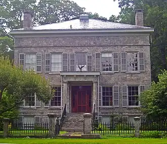 The house is a two-and-a-half-story five-bay stone building on a raised basement with a shallow hipped roof with small cupola and identical chimneys on the north and south. It is sided in a locally quarried granite with an unusual natural marbleized appearance in a smooth-faced ashlar pattern with quoins on the front (reverting to random ashlar on the rear and sides). The roofline has a plain frieze, simple cornice and is set off by a stringcourse.[2]